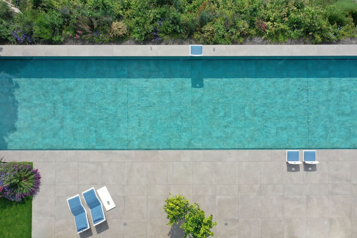 Herzstück der Anlage ist ein 50 × 5 Meter grosses Betonschwimmbad mit hochwertiger Plattenverkleidung. Die Linien sind ruhig, die Wirkung bewusst reduziert. Der integrierte Hubboden macht den Pool flexibel nutzbar — für Sport, Erholung oder Events. Funktionalität, ohne sichtbar zu werden.